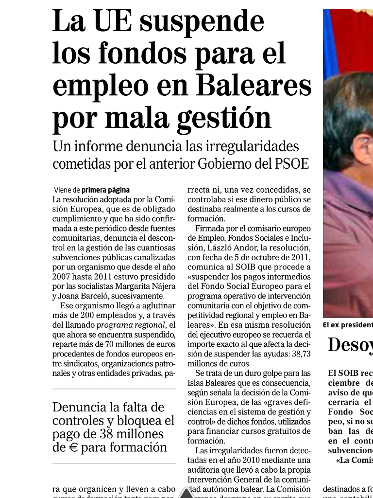 La UE suspende los fondos para el empleo en Baleares por mala gestión y decreta el bloqueo de 38 millon es de euros