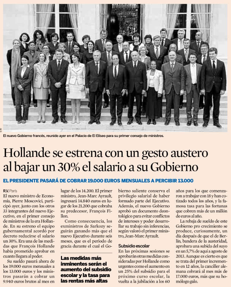 Hollande se estrena con una bajada de sueldo del 30% a su Gobierno
