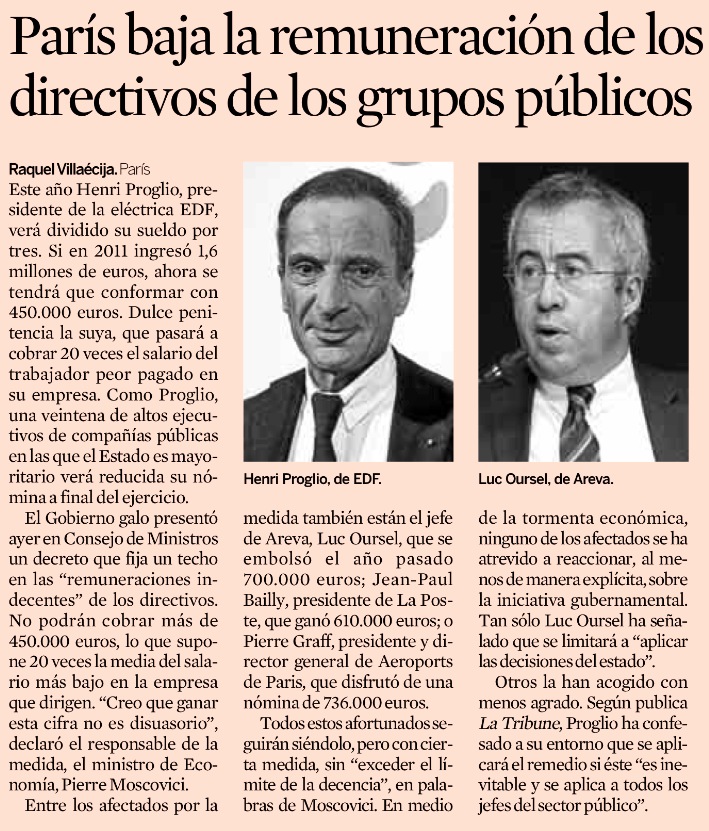 El proyecto del Gobierno francés fija un techo a las «remuneraciones indecentes» de los directivos. No podrán cobrar más de 20 veces la media del salario más bajo de la empresa que dirigen.