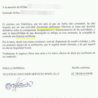 Algunos trabajadores del centro de trabajo de Teletech en Madrid han recibido por parte de la mercantil la carta que reproducimos. Recordamos que para que la documentación entregada por la empresa pueda ser revisada posteriormente y, en su caso, emprender acciones legales, es necesario fechar las cartas y firmar como «NO CONFORME».