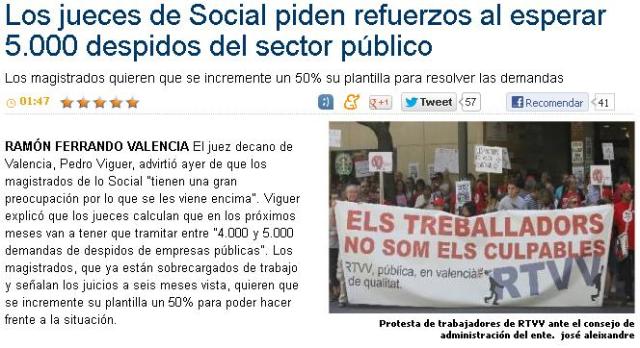El juez decano de Valencia, Pedro Viguer, advirtió ayer de que los magistrados de lo Social «tienen una gran preocupación por lo que se les viene encima». Viguer explicó que los jueces calculan que en los próximos meses van a tener que tramitar entre «4.000 y 5.000 demandas de despidos de empresas públicas». Los magistrados, que ya están sobrecargados de trabajo y señalan los juicios a seis meses vista, quieren que se incremente su plantilla un 50% para poder hacer frente a la situación.