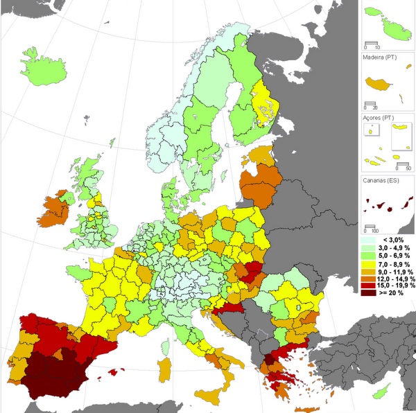 El mapa está confeccionado a partir de los datos anuales de desempleo de Eurostat de todas las regiones de Europa.