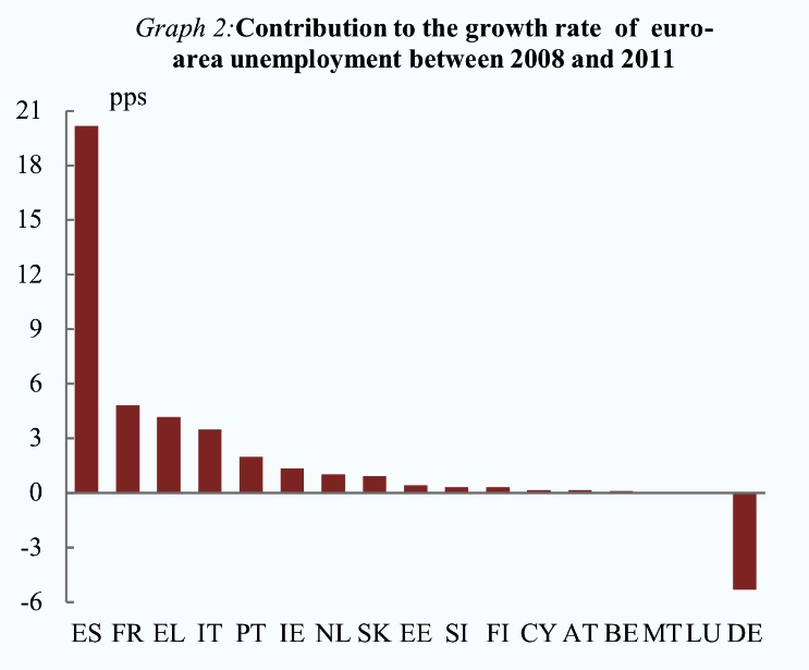 Gráfico: contribución por países al incremento de la tasa de paro en Europa