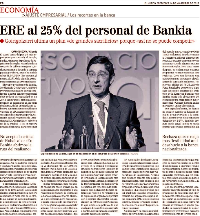 El diario El Mundo avanza en hoy miércoles en su edición impresa que Bankia ultima un ERE que supone al menos el 25% de la plantilla, actualmente en torno a 5.000 empleados.