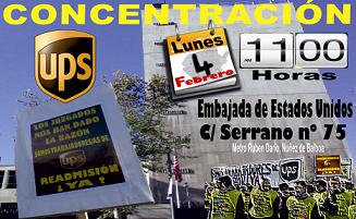 ANDET.- Los trabajadores y trabajadoras del centro de Vallecas de la multinacional norteamericana del transporte urgente UPS, harán una concentración el próximo lunes 4 de febrero a las 11,00 de la mañana, frente a la Embajada de los Estados Unidos, en la Calle Serrano, 75. Esta concentración forma parte del nuevo calendario de movilizaciones votado por los trabajadores en la última Asamblea.