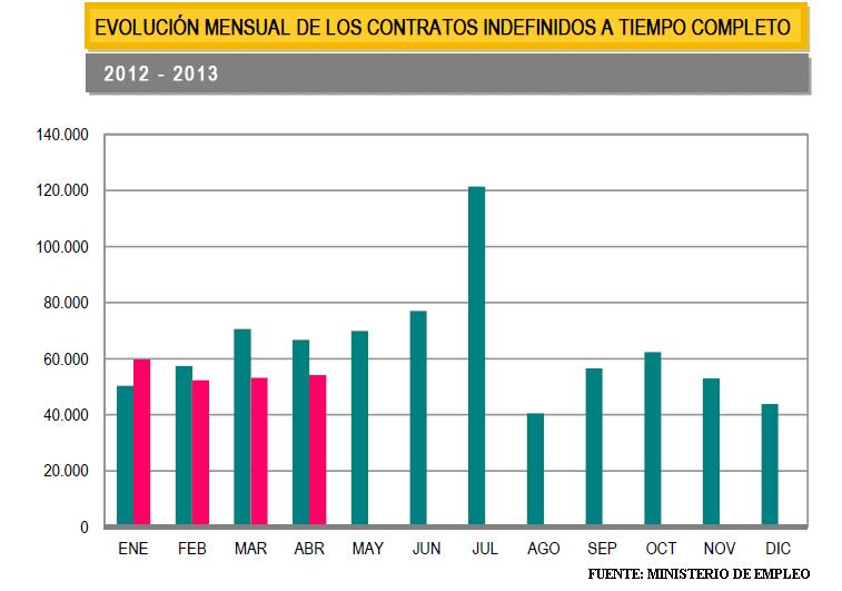 En el mes de abril de 2013 se han registrado 98.349 contratos de trabajo de carácter indefinido. Representan el 8,53% de todos los contratos. Supone un descenso de 16.904 (-14,67%) sobre igual mes del año anterior.