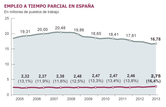 En España trabaja más que gente a tiempo parcial de lo que nunca lo ha hecho antes. Son 2,75 millones, según la última encuesta de población activa (EPA), el 16,4% de todos los ocupados. Una paradoja: en los cinco años largos de crisis el número de empleos ha caído en poco más del 18% desde máximos; en cambio, ha crecido en el mismo periodo eltrabajo a tiempo parcial en poco más del 20%.