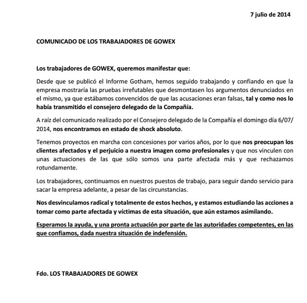 Los trabajadores han afirmado que desde que se publicó el Informe Gotham han seguido «trabajando y confiando» en que la empresa mostraría las pruebas «irrefutables» que desmontasen los argumentos denunciados en esta publicación, «convencidos» de que las acusaciones eran falsas como les había asegurado el propio García.
