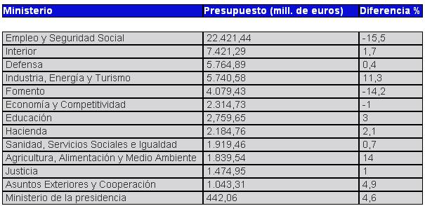 En el desglose, tres ministerios pierden presupuesto respecto a los presupuestos de 2014, encabezados por el Ministerio de Empleo y Seguridad Social, para el que están previstos 22.421,44 millones de euros, un 15,5% menos que en 2014, aunque seguirá siendo el ministerio que con diferencia más asignación tiene.