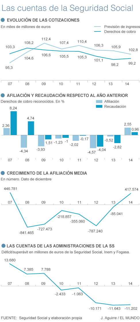 El mejor año para el empleo en la crisis fue, sin embargo, el peor para la Seguridad Social, que registró un déficit histórico de 15.006 millones en 2014 (excluyendo Fogasa e Inem), equivalente al 1,42% del PIB.