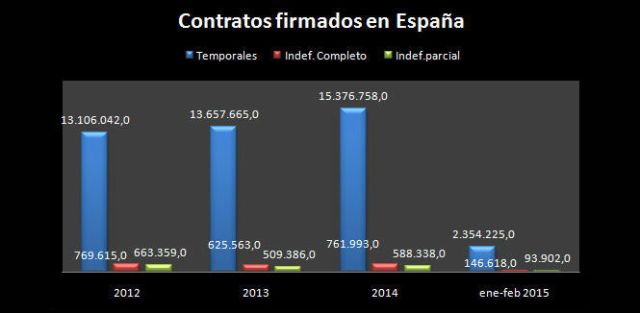 Los mayoritarios en nuestro mercado laboral continuaron siendo los temporales: el 90,7% de los contratos firmados continuaron siendo temporales. En total, de los 2,6 contratos firmados en los dos primeros meses de 2015, 2,35 millones tenían fecha de caducidad.