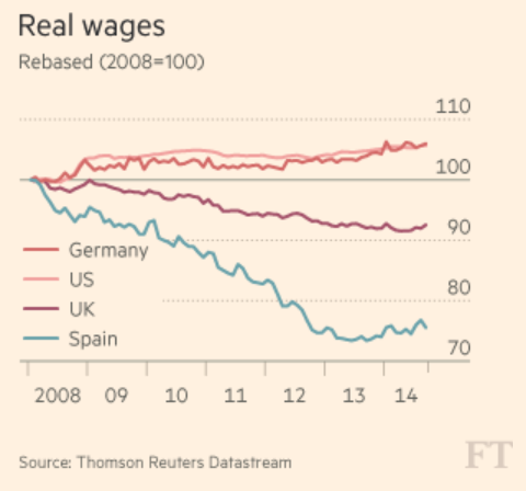 ¿Y cuál ha sido la consecuencia? Acudimos a las cifras de la agencia Thomson Reuters que ha publicado el diario Financial Times para descubrirlo. Según sus cálculos, desde el año 2007 los salarios reales han caído en España un 25%, mientras que en Reino Unido lo han hecho a un ritmo del 7,5%.